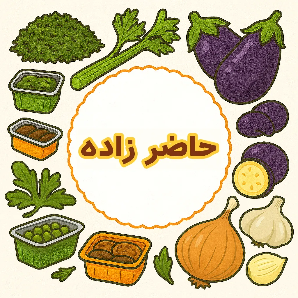 محصولات حاضر زاده: سبزی قرمه آماده، کرفس آماده، بادمجان خورشتی، بادمجان سرخ شده، لوبیا سبز آماده